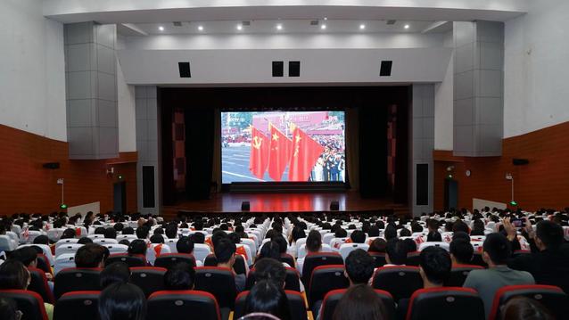 升旗仪式结束后,565net必赢客户端留校学生前往大学生活动中心报告厅观看中华人民共和国成立70周年大会直播。大学生活动中心报告厅565net必赢客户端区域座无虚席。观看庆祝中华人民共和国大会过程中,各位同学紧紧跟随大会进程,高唱国歌,向国旗行注目礼。同时565net必赢客户端也通知学院老师收看大会直播,在学院微信群里,各位老师晒出自己观看电视直播、通过学习强国收看直播的照片,通过微信小程序争做升旗手等活动,表达自己的爱国之情,共同分享强大祖国的成就,共享新时代的荣耀。