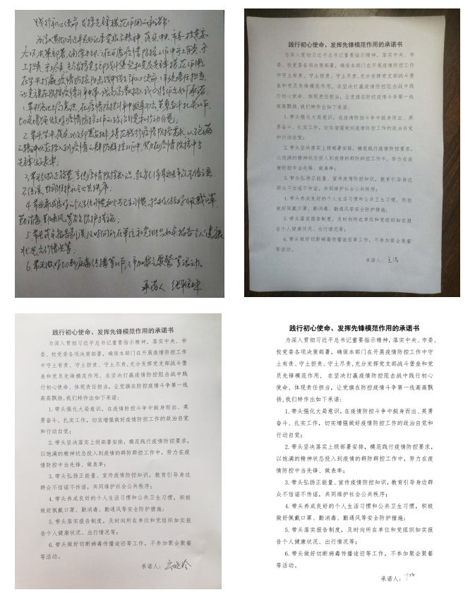 全体党员简单介绍自己实际情况,及如何开展疫情防控知识宣传和志愿服务,每个人都充分发挥党员的先锋模范带头作用,全力以赴做好疫情防控。最后,各位党员纷纷在共产党员防范疫情我当先锋承诺书上签下了自己的名字