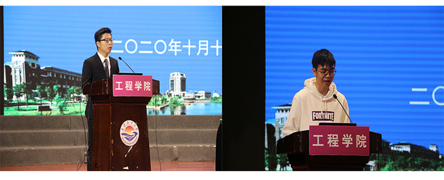 紧接着2020级机械工程专业研究生袁鑫泰和2017级机制2班本科生龙振东分别作为新、老生代表进行了发言。新生代表袁鑫泰号召大家用严谨的科学精神和踏实的科学态度对待科研任务,要立志做优秀的海大人,勇攀科研高峰,焕发青春光彩。老生代表龙振东从自身经历出发,勉励新生同学们接纳平凡、保有不凡,希望大家在本科阶段积极参与科研项目;同时在此基础上,希望同学们多多参与团学活动,提升实践能力。也鼓励新生把专业所学与国家发展相结合,担当时代使命。希望学弟学妹们都能保有格物致知、抽丝剥茧的学问态度,严谨治学,在未来的大学生活中谱写美好的篇章。