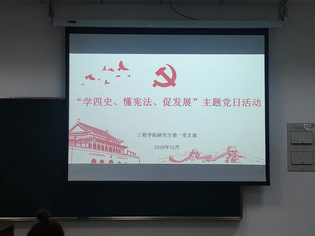 2020年12月14日,研究生第一党支部在教学楼1401召开了12月主题党日活动,会议的主题是“学四史、懂宪法、促发展”,集中学习《中华人民共和国宪法》、《中华人民共和国民法典》和《中国共产党普通高等学校基层组织工作条例》,并传达了习近平总书记在中央全面依法治国工作会议上的讲话精神,并进行了深入地学习交流。