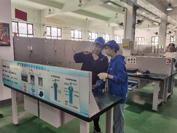 王洁(左)带学生金工实习
