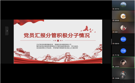 会议伊始由党员汇报分管积极分子情况。正式党员考察预备党员,预备党员考察积极分子,分别从考察对象的思想动态、学习动态、生活动态和工作动态等几个方面进行汇报分析。根据预备党员们的汇报情况,积极分子整体思想上积极向党组织靠拢,态度积极,学习认真,工作负责,给予了积极分子们较高的肯定,同时也指出了改正进步的地方。