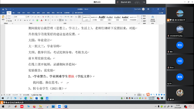 4月10日,结合学业导师反馈的信息,系室基层成员研究相应的解决方案,形成了以“学业导师+课程教师”帮扶和“学生一帮一结对”帮扶相结合的模式,并通过线上会议与相应的学业导师、课程教师、结对学生进行交流,针对困难学生个性化的问题,科学、巧妙的研究相应解决方法,争取能切实打通学生毕业的“最后一公里”。