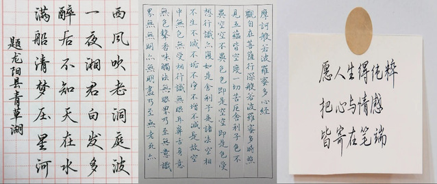 “千高望远忘世虑,写字读书皆有趣。海大代有人才出,且看学子试笔芒”。几位同学利用闲暇时间,将心寄予笔端,通过写字摘录诗歌、佛经等经典作品,平心静气、修身养性,从写字中获得最纯粹的快乐,在陶冶情操的同时还收货了一手好字,就如古人所说:读书当努力,写字莫糊涂。