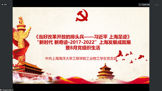 2022年8月2日,工业物工学生党支部全体党员、预备党员在腾讯会议线上开展了工业物工八月党组织生活,会议上认真学习了《当好改革开放的排头兵——习近平 上海足迹》