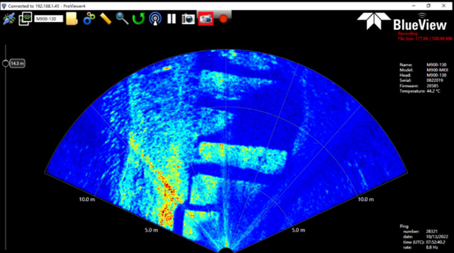 经过一年的技术优化和设备改造升级,2022年10月,团队与合作单位所研发的水下巡检装置成功应用在渤海西部海域NB35-2CEP至世纪号海底管缆治理作业中(图2),迈出了水下管缆隐患治理辅助作业装置从理论研究到生产应用的关键一步,实现了从常规潜水作业向智能辅助作业的根本性转变。渤海是目前我国海上最大的海洋油气生产区域,如果把渤海油田比作全国油气的“心脏”,海底管道则是把油气输送至各地的“血管”。本此海试中,逐步攻克了低能见度环境作业、实时定位、自主避碰系统开发等难题,对三处海底管道防护装置铺设情况进行了定点检查和沿线巡检作业,获取了试验全过程的检测视频与数据(图3),得到了作业单位的高度认可。