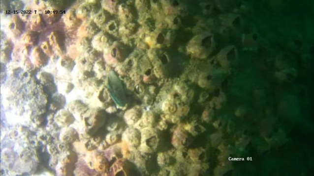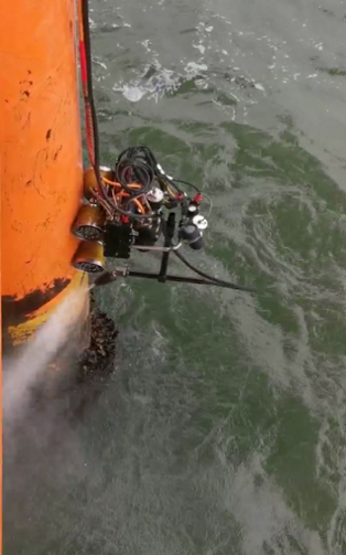 在短暂的休整后,2022年12月9日~16日,团队远赴湛江北部湾海域,针对海洋石油163平台开展了平台桩腿以及膨胀弯水下检测作业,目前第一阶段作业任务已完成。“海洋石油163平台”是我国自主设计建造的首座海上可移动自升式井口平台,因其具有可升降、可移动、可重复利用的特点,被业内形象的称为“小蜜蜂”。由于该平台甲板距离海面18米以上(图4),南海冬季季风每天风速都在7级以上,4-5级浪是日常,每次的机器人下放都是一种全新的挑战,机器人的每一个动作都让大家捏一把汗。海试团队经过现场多次演练、水面安全监控布置等措施,有效地降低了安全风险,完成了对平台3号桩腿从水面至入泥处的全面无损检测,获得了高清的桩腿结构和表面附着海生物画面(图5),初步完成了作业任务,本次海试让团队的信心更足了!