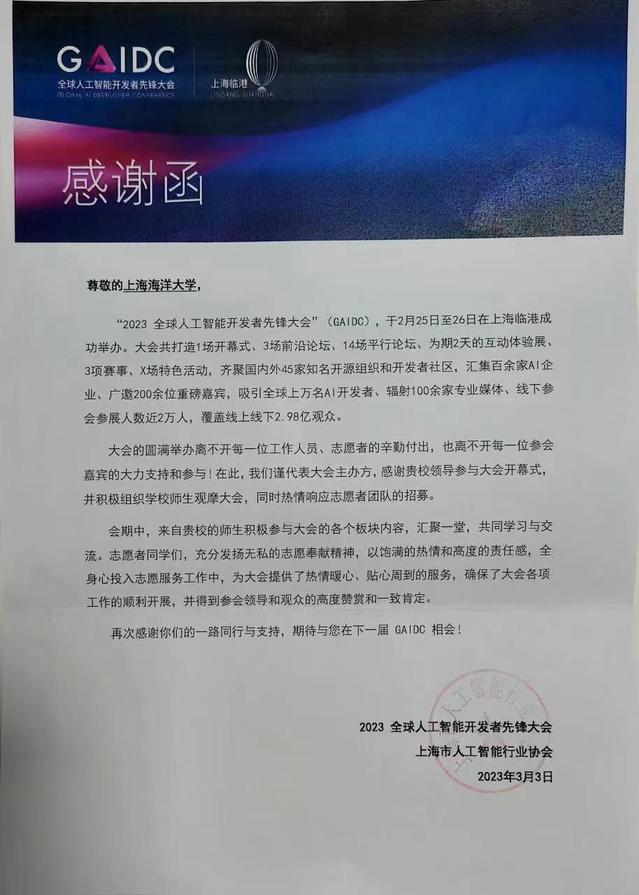 近日,上海市人工智能行业协会致信学校,对我校参与“2023全球人工智能开发者先锋大会”(GAIDC)表现突出的志愿者们予以肯定,对学校的大力支持和积极参与表示衷心感谢。