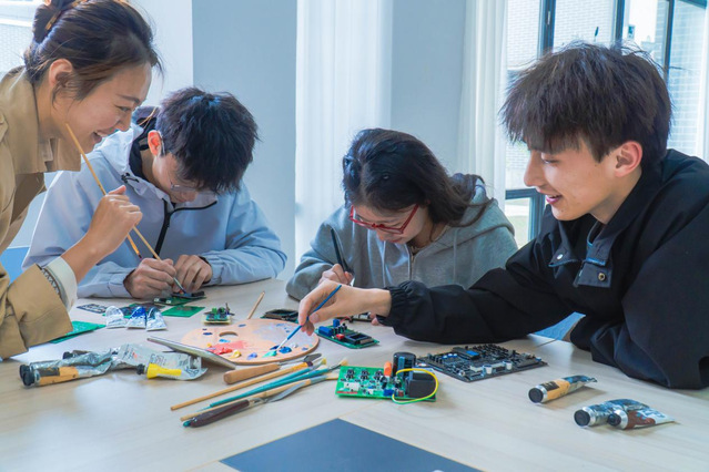 565net必赢客户端学生谢宏胜介绍了首期活动的内容,为同学们讲解水彩调色技巧和色彩搭配原则。邓德华鼓励同学们自己尝试、边听边画。当废旧电路板与水彩、油画等元素混合,一件件既“美”又“好”的作品让同学们充分感受工科与艺术相融合的魅力。