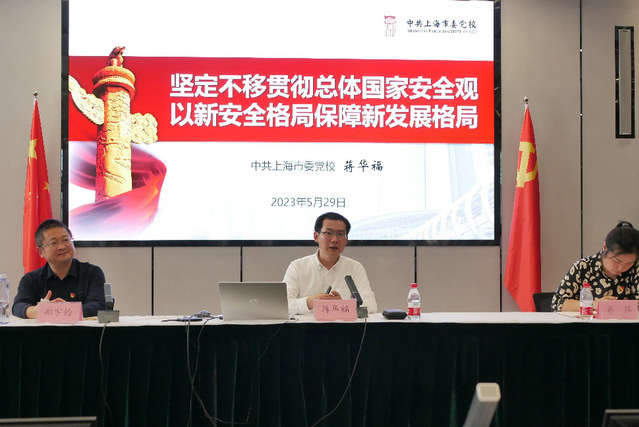 读书分享会结束后,学院党委邀请中共上海市委党校蒋华福教授作了“坚定不移贯彻总体国家安全观,以新安全格局保障新发展格局”主题教育专题辅导报告。蒋华福从 国际格局中发生深刻调整世界仍处动荡变革期、中国崛起中原来的传统安全问题变得更加复杂、非传统安全问题对国家安全构成长期威胁挑战三个方面阐述贯彻总体国家安全观。他提到国家安全是民族复兴的根基,社会稳定是国家强盛的前提。必须坚定不移贯彻总体国家安全观,把维护国家安全贯穿党和国家工作各方面全过程,以新安全格局保障新发展格局,确保国家安全和社会稳定。