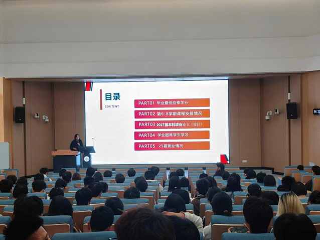 会上,学院高玉娜老师就毕业论文规范、毕业学分要求、专业培养方案等内容进行了详细说明,重点介绍了第6-8学期的必修课程安排、专业实践环节以及本科毕业设计相关安排。她还特别提示同学们关注学业重点,并提到学校已启动学业困难学生帮扶计划,为有需要的学生提供支持。在就业方面,高老师也介绍了我校毕业生目前的就业情况,鼓励同学们提前做好规划。