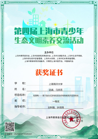 近日,由上海市教委、上海市发改委等十部门联合主办的第四届上海市青少年生态文明素养交流活动圆满落幕。565net必赢客户端本科生达崴、马依茗团队凭借作品《知潮鸭——基于复合式发电机的自供电智能海洋监测系统》,在众多参赛项目中脱颖而出,荣获高校组一等奖。团队指导教师刘利强、许竞翔同步获评“优秀指导教师”。